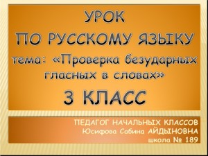Урок на тему «Проверка безударных гласных в корне слов» был проведен в 3-ем классе школы №189 Сабаильского района педагогом Юсифовой Сабиной по учебнику русского языка (авторы Бэла Нуриева и Нигяр Мустафа-заде). Урок был построен при совмещении двух технологиий: педагогической технологии Конструктивного обучения и ИКТ. Умелое пользование педагогом компьютерными технологиями делал урок ярким, красочным и в то же время интерактивным. На основании принципов технологии Конструктивного обучения данная тема — «правописание безударных гласных в корне слова» была интегрирована с такими темами , как правописание безударных гласных в приставках, в суффиксах и в окончаниях. Организованная педагогом познавательная деятельность учащихся, путем постановки логических вопросов выводит их на понимание сущности темы и превращение этого понимания в знания.