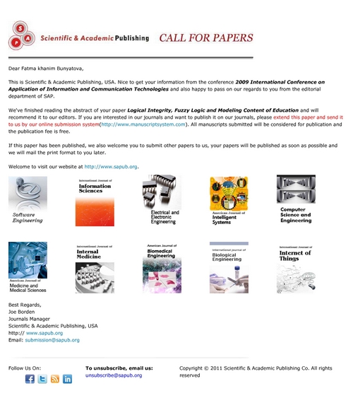 Poçtumuza gələn məktublarda müəlliflər məktəbimizin gördükləri işin, yazımızın davamlı olaraq Amerikanın, Avropanın, Uzaq Şərqin indeksli kompyuter təhsil texnologiyaları jurnallarında çap etməkləri arzusunda olduqlarını bildirir, məruzələrlə çıxışa dəvət edirlər.